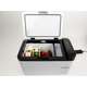 This 12V/24V cooler with a volume of 26 liters combines compact dimensions and modern design. The valuable compressor allows a cooling range from +20 ° C to -20 ° C. The temperature setting is made via an LCD touch display. Other features: LED- interior lighting, recessed carrying handles, USB port, MAX & ECO mode, integrated battery protection. The height of the cooler is chosen to fit under the front end of the Reimo seat/sleeper benches V3000 and V3100 folded into a bed.